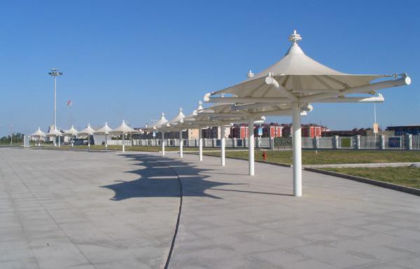 3、張拉膜結構長廊遮陽棚具有的特殊防紫外線功能,不僅使人體皮膚免受紫外線的侵襲,而且大大延長了室內裝修和家具的使用壽命,遮陽棚有著豐富多彩的遮布花型、顏色,用戶可根據需要選擇。
